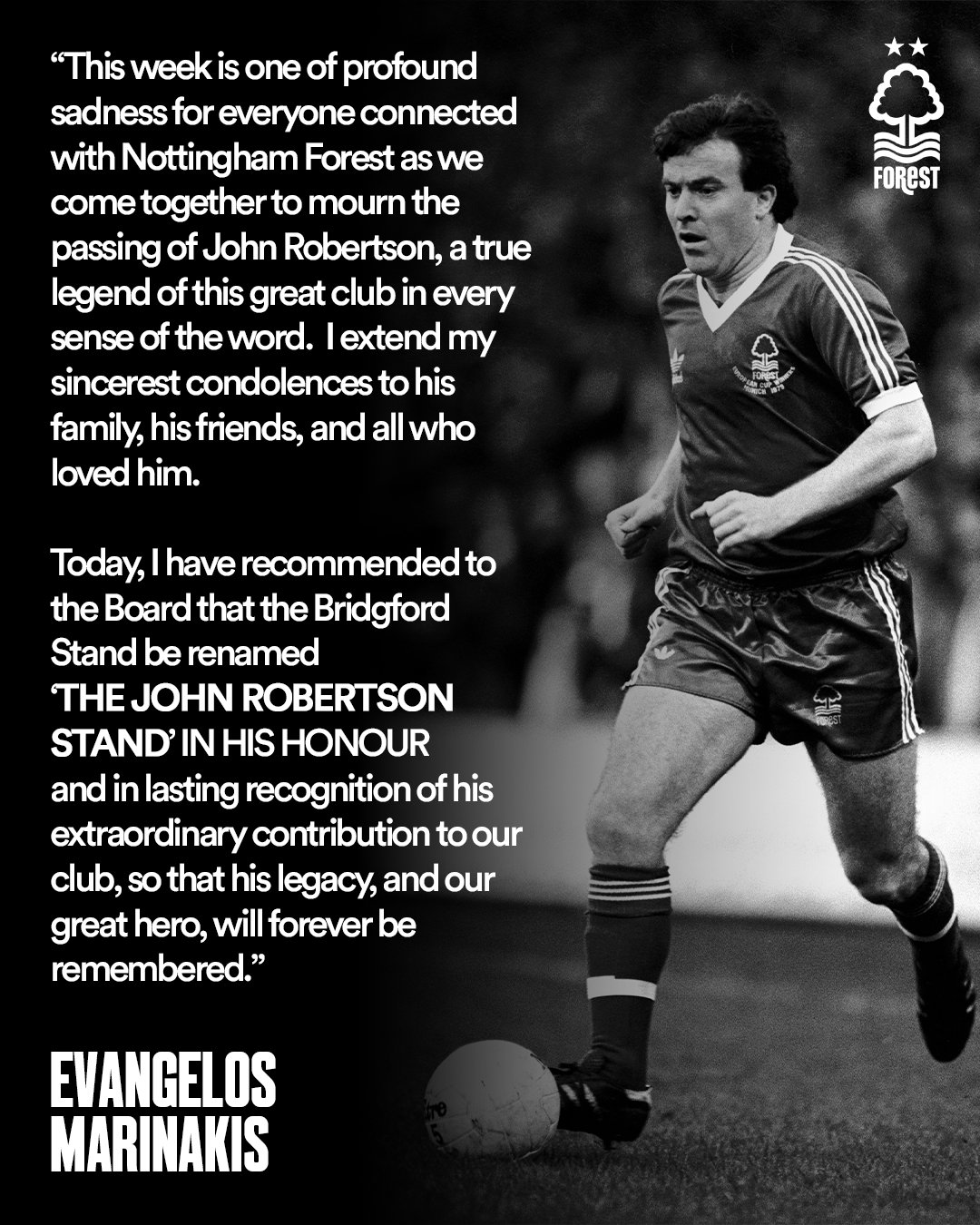 對于所有與諾丁漢森林有關(guān)的人來說,本周都是一個無比悲痛的時刻。我們齊聚一堂,悼念約翰-羅伯遜的離世——他在任何意義上,都是這家偉大俱樂部真正的傳奇人物。